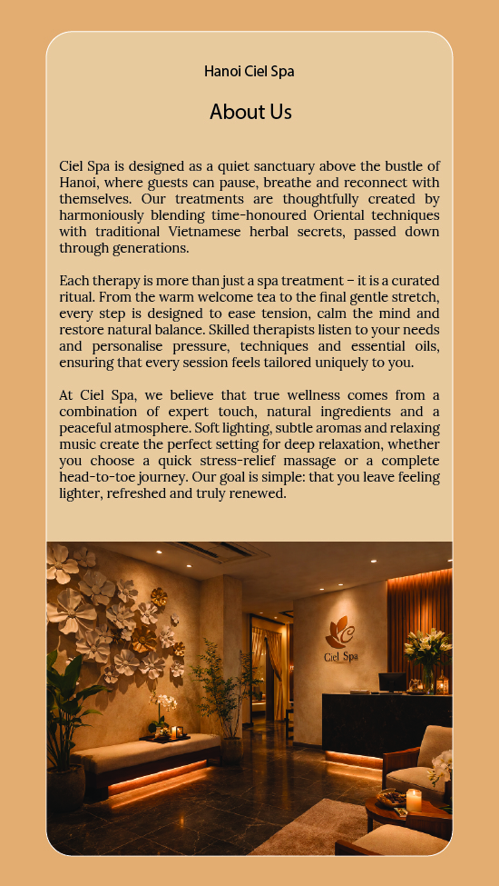 Ciel Spa is designed as a quiet sanctuary above the bustle of Hanoi, where guests can pause, breathe and reconnect with themselves. Our treatments are thoughtfully created by harmoniously blending time-honoured Oriental techniques with traditional Vietnamese herbal secrets, passed down through generations.